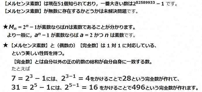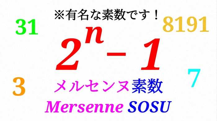 メルセンヌ数が素数であるとき,【メルセンヌ素数】 (Mersenne prime) という。