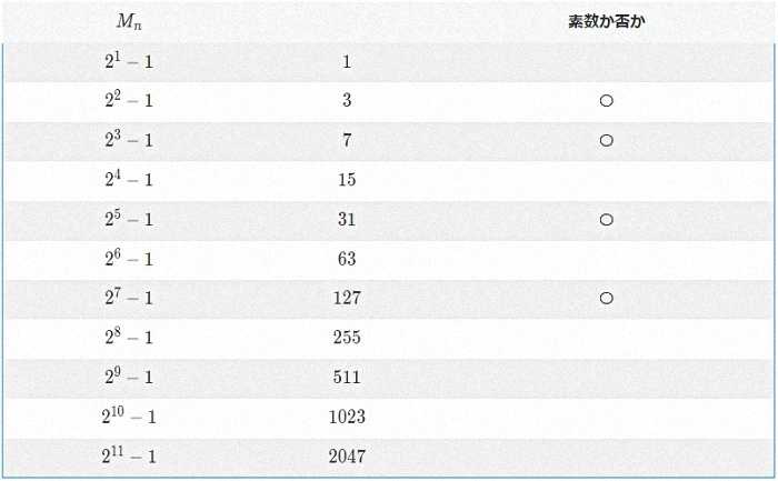 メルセンヌ数・メルセンヌ素数の具体例を挙げてみると、