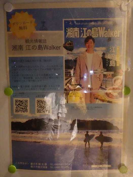 公衆トイレの壁には「観光情報誌 湘南江の島Walker」のポスターが。