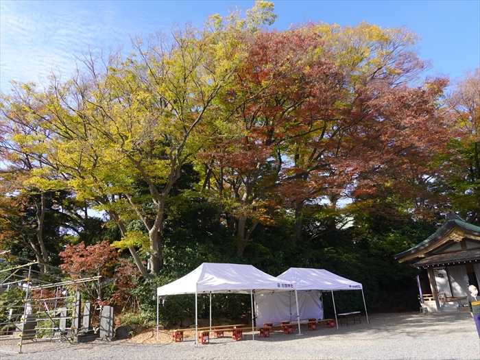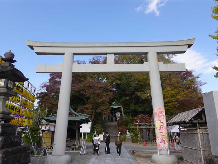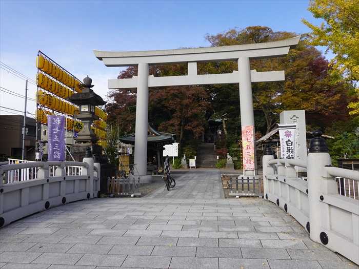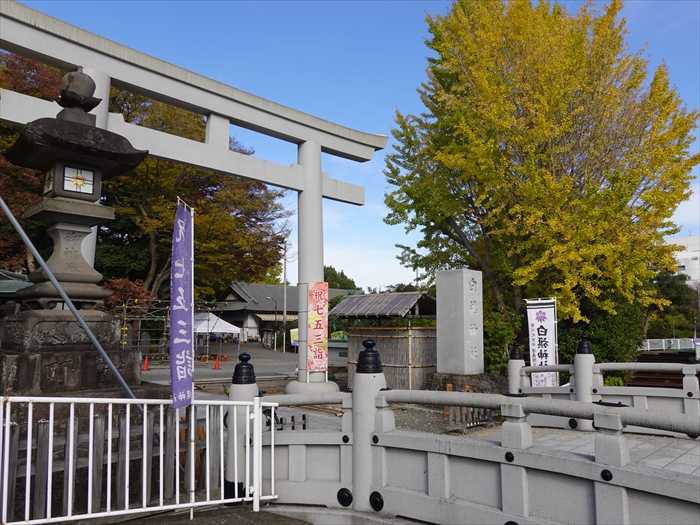 手前に「白旗神社」の「御典橋」とその奥に「鳥居」。