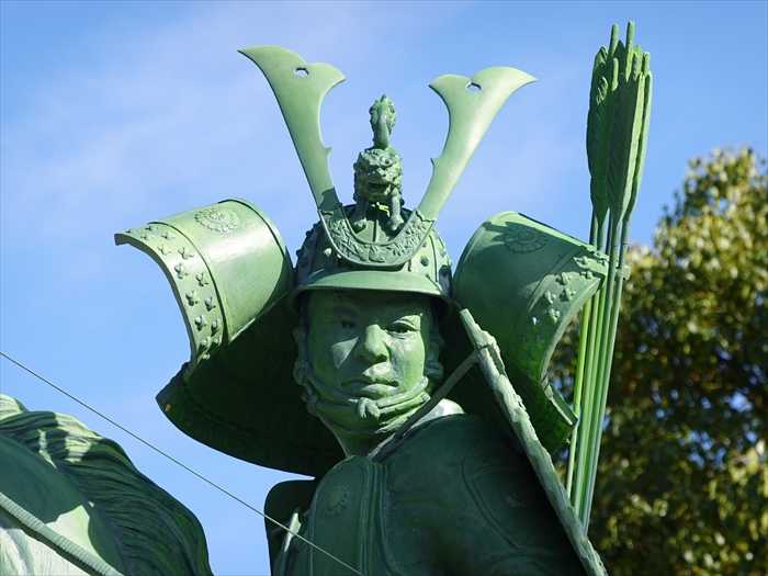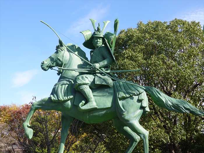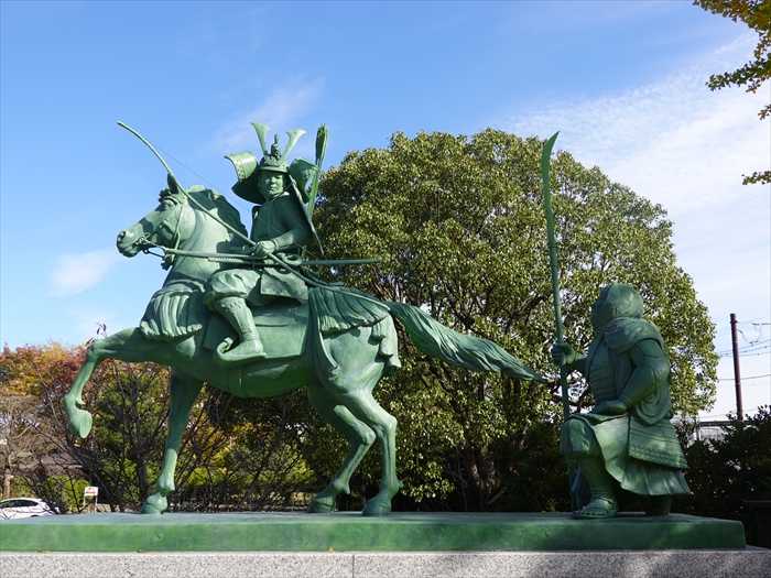 平安武将の大鎧を再現した見事な源義経騎馬像。