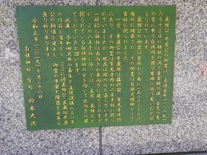 「義経公・弁慶公の御首は、文治5年(1189)6月13日に腰越の浜で首実検の後、金色の亀に