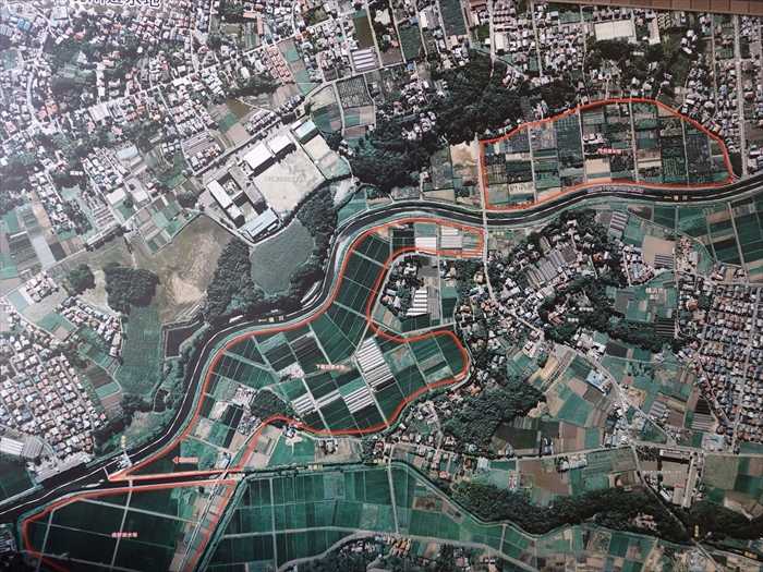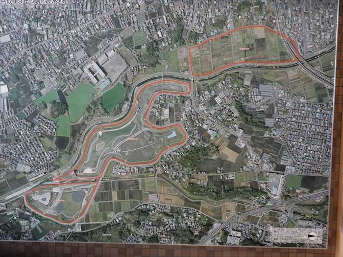 「境川遊水地 情報センター」内にあった「 県立境川遊水地公園 」周辺の航空写真。