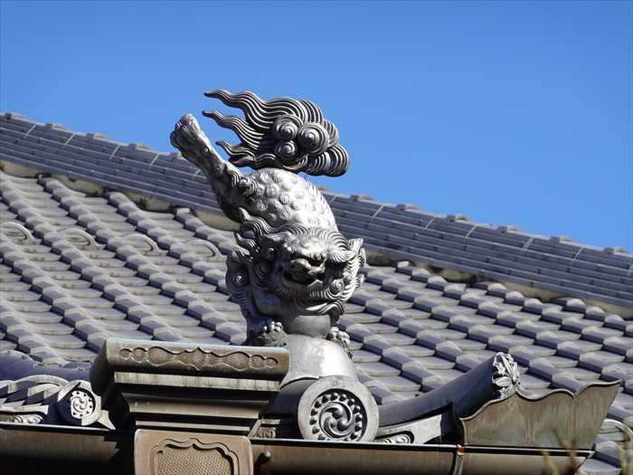 屋根の飾り「 巴蓋(ともえぶた) 」には獅子の姿が。