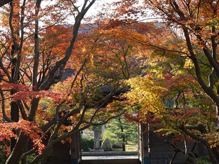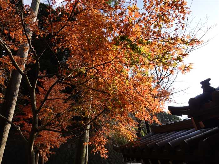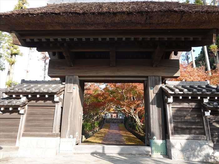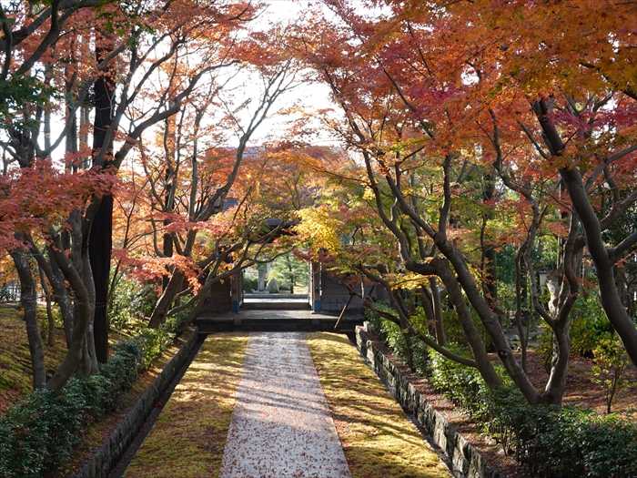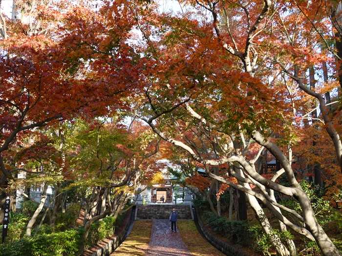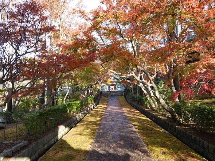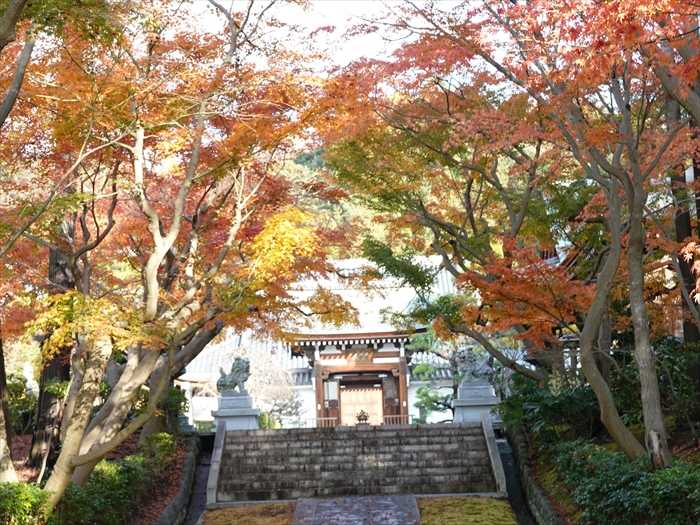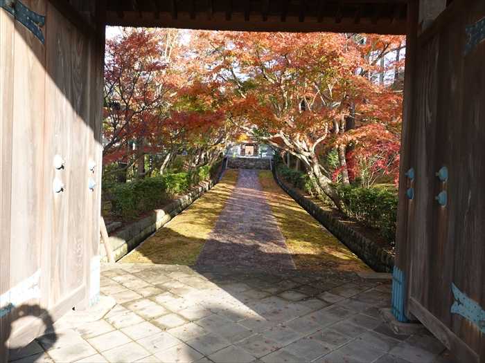 「天嶽院」の「山門」は西向きに建っているので、紅葉の参道に陽光が入りこむのは