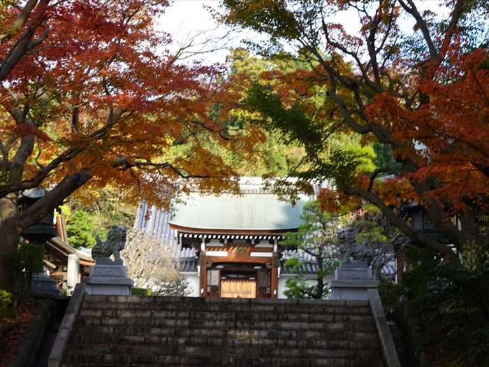 モミジのトンネルの中から眺めた石段上の堂宇境内。