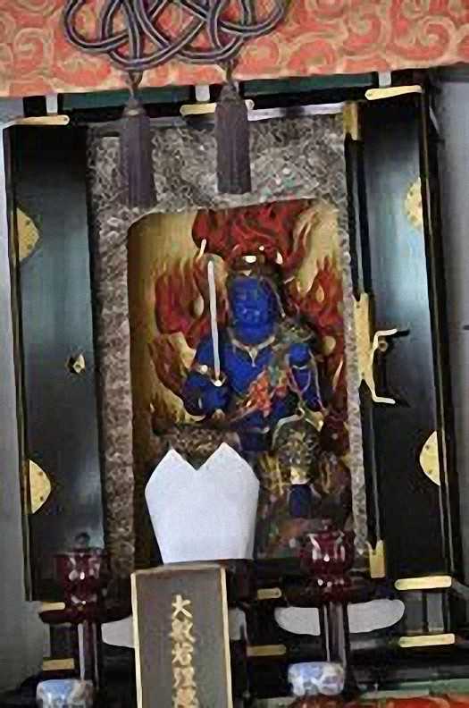 火焔を背負って鎮座する宝剣と羂索を持つ濃い青色の「 不動明王像 」。