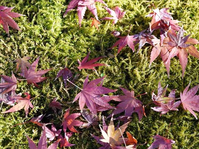 モミジのトンネルに続く切石敷の参道....石畳とその左右に敷き詰められた苔の緑が
