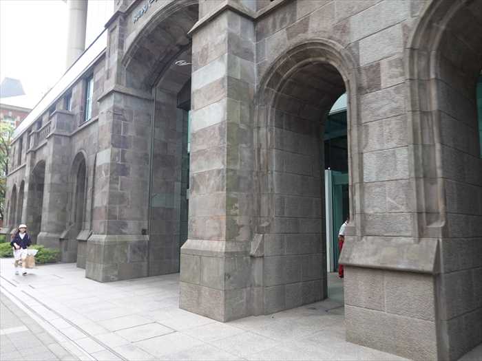 旧「丸ノ内八重洲ビルヂング」のうち、小松石の粗石積みの低層部分とコーナー部分の尖塔が