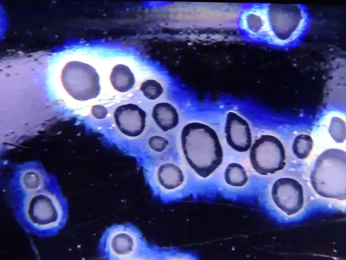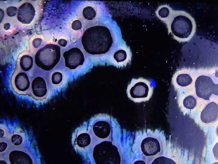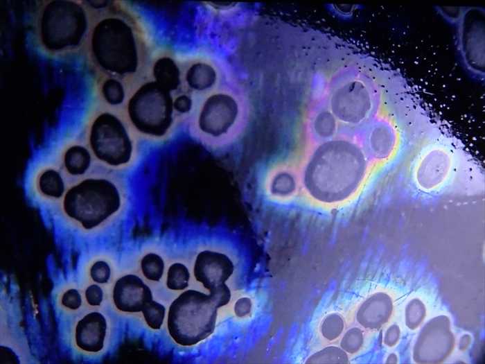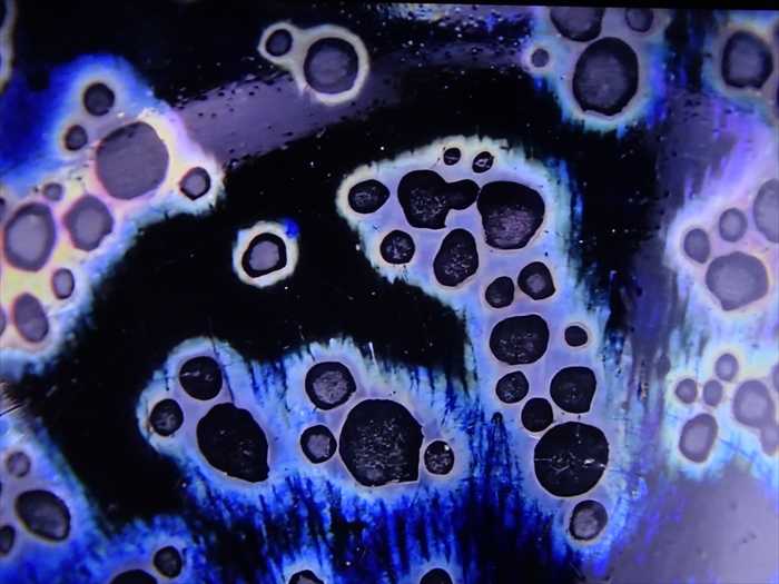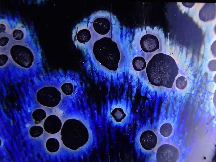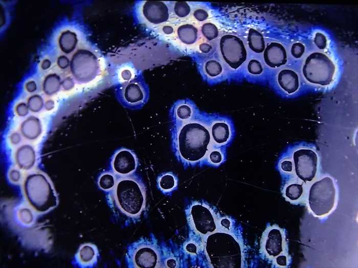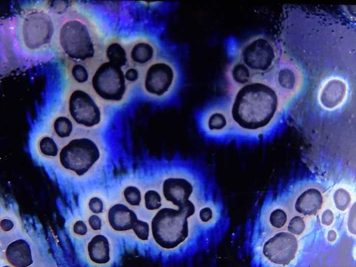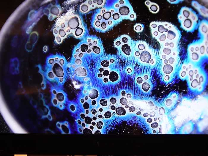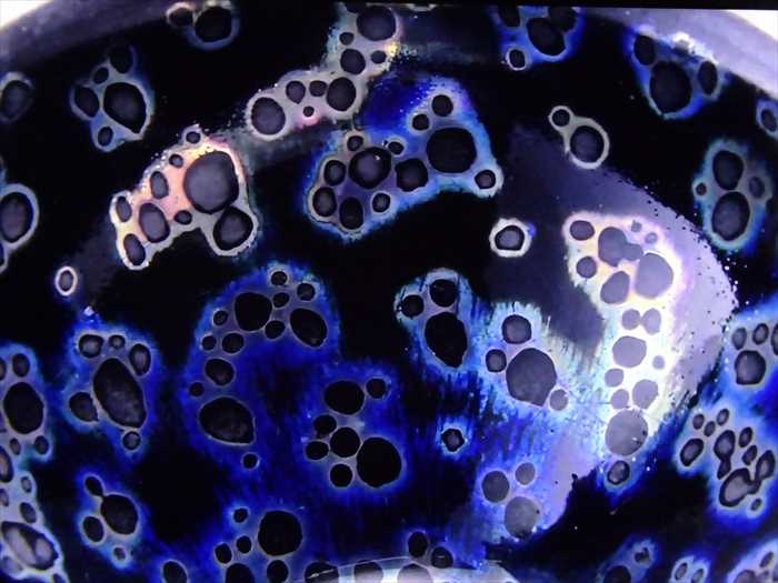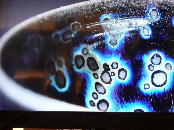 黒釉の掛かる碗の内面に大小の斑文が浮かび、青く輝く光彩が現れたものをいう。
