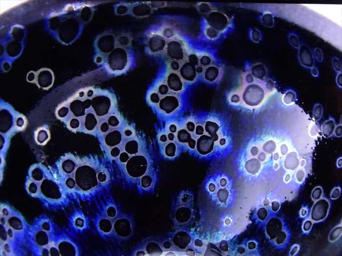 黒釉の掛かる碗の内面に大小の斑文が浮かび、青く輝く光彩をお楽しみください