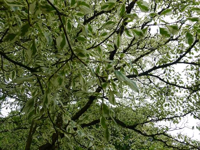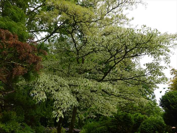 葉の真ん中が白、周囲が緑の葉の樹木。