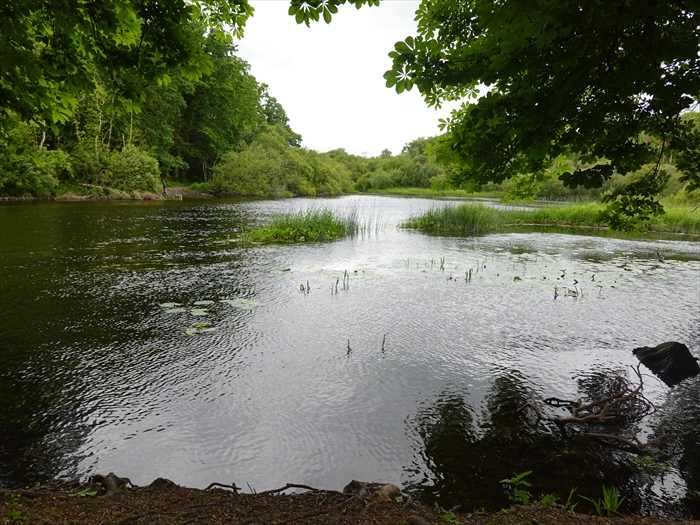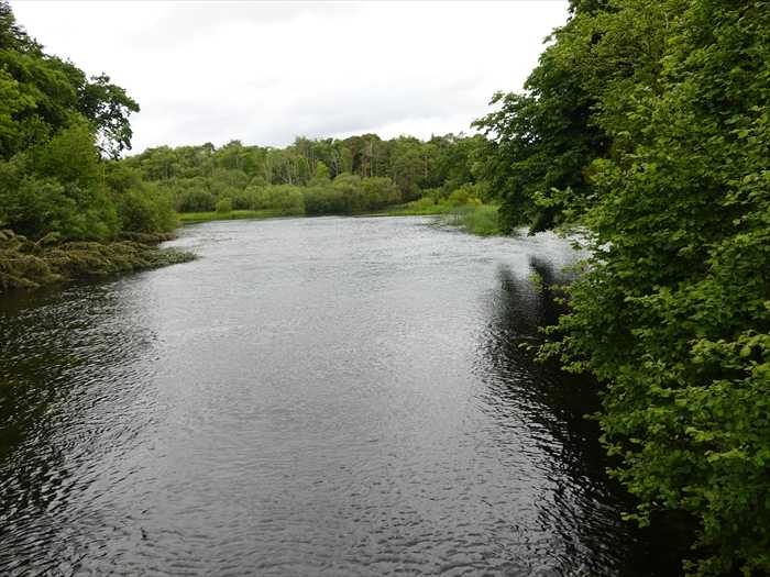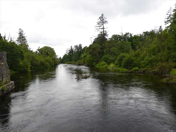 On the western side of the bridge (i.e. on your left if facing away from the village), you can see a mild disturbance in the water which marks Poll Tuathail, also referred to as The Pool of the Turning Waters or The Northern Pool.