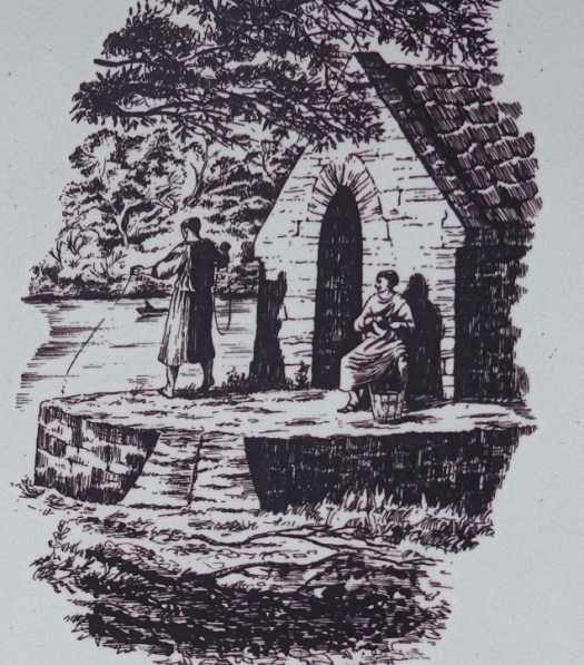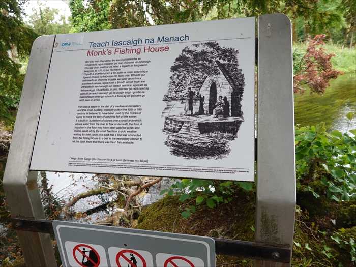 The building before you, called the Monk’s Fishing House, is believed to have been constructed in the 15th or 16th century. The monks are thought to have sat inside, dry and sheltered, while fishing through an opening in the floor. A fireplace provided warmth in cold weather.