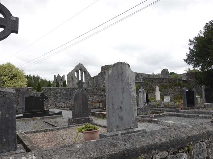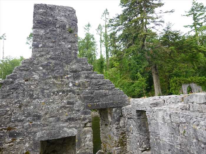 The grounds and interior of the Abbey have been the final resting place of the people of Cong and its neighbourhood for many centuries. Some gravestone memorials dating back to the early eighteenth century can still be deciphered. For example, in the centre of the chancel, on your left as you enter through the archway, is a beautifully carved slab stone commemorating James Lynch, Abbot of Cong, who died in 1703. Close by, part of a family crest — a right-angled arm with the hand holding a cross — identifies the gravestone of members of the McDonnell family of Ahalard Castle.