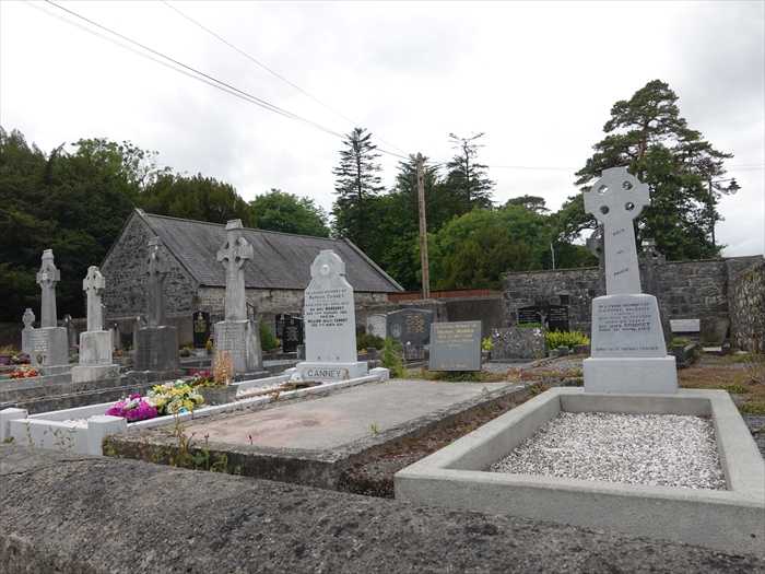 A short distance away, diagonally opposite the chancel window, is a large Celtic cross marking the grave of Michael O’Brien, killed on the Partry Mountains during the War of Independence. His gravestone inscription is in the Irish language. Translated it reads as follows: