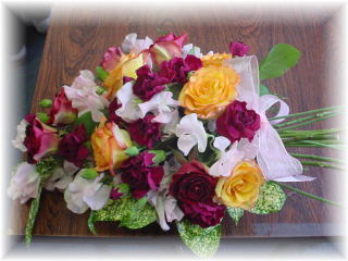 昨日の日記にUPするの忘れてたので・・・。昨年末に言ってた「フラワーアレンジメント」行ってきましたー。土曜日どしゃ降りの中&前日3時間睡眠でフラフラしながら「私・・・なにやってんだ」と思わないでもなかったですが(笑)やってみたら結構楽しかった-vv一応、学生時代に華道&茶道は一通りやったんです。・・が、どうもしっくりこず、免状を持ってるだけ状態で10年ほど全くやってなかったのです~(^^;;)でも、フラワーアレンジメントって華道と違って、基本の形を押さえるだけで、あとは自由に花をガシガシ挿していくので結構楽しい~vv(ガシガシって言ってる時点でダメだよ・笑)出来たのはこんなの↓「花束をそっと横たえた感じ」に挿す予定が何か丸々してる・・・(≡д≡) ※下に花器があるのでそのまま置いて飾れる様になってます。 ま、初めてってことで~(笑)先生に「アレンジって自由に挿せる分、性格がでるのよー」って言われました。・・・え。それって丸々してるってこと?(笑)ちょっとまた行きたくなりました。月1ぐらいだったらいっても良いかなーvvさあ、次は(これも年末に言ってた)「トールペインティング」ですよ~。うーん。行ってる時間あるかなぁ。<HOMEへ戻る>1日1回 ポチッと押して頂くと更新の励みになります♪↓ 人気blogランキングへ