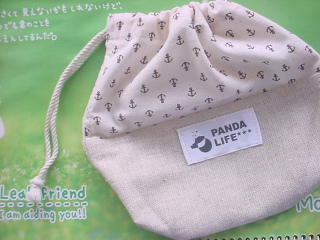 先日、日参させて頂いている楽天ブロガーの ★パンダマニアさん★が手作り雑貨のネットショップをオープンされました。パンダグッズ満載でめちゃめちゃ可愛いですーvvで、早速お買い物~日記に掲載しても良いとの許可を頂きましたのでパンダのマリンプリント巾着。やっぱ今年はマリンでしょーvvでも、こういう大人向けのシック&ナチュラルな色合いの物って中々売って無いんですよねーvvパンダのオリジナルタグも超可愛い♪早速、娘に見つかって狙われておりますが死守しております(爆)(娘はバッグ・袋物好き)手作りでこんなのが作れる方っていいなー。雑巾縫うのにも四苦八苦している、ひつじ屋には尊敬の的です。7月から本格オープンされておりますので、パンダ好きの方も雑貨好きの方も必見です~♪<HOMEへ戻る>1日1回 ポチッと押して頂くと更新の励みになります♪↓ 人気blogランキングへ