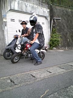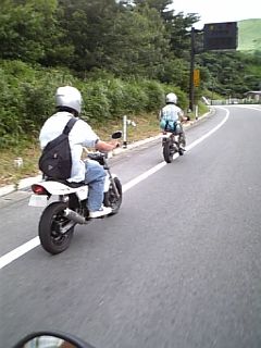 今日はチャンバーが届くまでに慣らし運転終わらせようとアッキーと阿蘇まで登ってきました家出るときに兄が出勤するところだったので『そういや走ってるとこ見たこと無いなー』っと思いつつ後を追ってみる事に・・・・今日は残念ながらCBRではなく通勤用のスクーターでした兄がローリングしながら下っていく・・・コイツ遊んでやがるな・・・坂を下りながらの第1カーブ居なくなりましたいや、1本道よ?wカーブ抜けてからの直線にも姿が無いwやっと見つけたのが大通りに出てからでしたその後ウイリーしながら前を走る兄・・・・遊ばれて負けますた つд;)そんなこんなで待ち合わせ場所へ今日もNS-1でした阿蘇方面へ膝すりを試みながら登っていく・・・・風車がレーザーで打たれた瞬間途中、休憩所で異変に気づく・・・・アプリと俺の服に黒い点がびっしり・・・・アッキーの2ストオイルがサイレンサーから飛び散ってました・ω・")公衆トイレのトイレットペーパーでフキフキ・・・・その後勝利の水浴びこの写真、一見RSが小さく見えますが俺がでかいだけですw油まみれもあれなので温泉に入りました(温泉の駐車場w『ぼくミ○キー』 『さぁ行くよ!!』など叫びだすバカ二人・・・・その後、草千里へいきました~赤毛和牛~♪黒毛和牛も~♪山に登ると圧縮悪くなって全然パワー出無いんだよね。。。有料駐車場に止めるのもアレなのでbike is freedom♪ してきましたw (いわゆる駐車違反そして70キロで優雅に山を降りて帰ったのですが明日、うまくいけばアッキーは中型取るらしい・・・たかも、もうすぐ取る・・・(たかはモンキー乗るらしいけど付いて行けなくなるなぁー。。。俺も進学して免許とったらボアうpするかな~だれかボアアップキット個人輸入できる人居ませんかぁ~?w