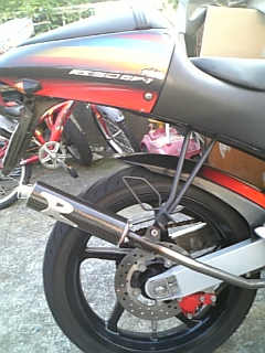 今日はじいちゃんの初盆でした・ω・)そしてついに届きましたよ!!チャンバーが!!♪バイクで取りに行こうと思ってたけどこんなにでかかったので車で行ってよかった^^;箱にスペースありすぎてスカスカwカーボンシート巻きのショートサイレンサー明日までガマンできずに暗い中取り付けましたwPM8:10作業開始カウル外したところですこのノーマルチャンバーとも今日でおさらば‘・ω・)ノシ兄の力を借りながら取り付けを進める・・・ノーマルチャンバーはずしたところお・・・・重っ新しいチャンバーと10キロほど重さが違います新チャンバー軽すぎwバネに苦労しながらも取り付け完了!さっそくエンジン始動!!アイドリングが3000回転まで上がってます‘・ω・`)ノーマルチャンバーが詰まっていた事が明らかにちなみにノーマル時は1500回転でしたとりあえずキャブ調整をして2000回転まで落としました音もボボボボボボ・・・・っと警戒に排気されるようでエンジンがとても元気!!ノーマルチャンバーのヘタレぷりが伺われます^・ω・^)作業終了時間PM9;31 作業時間1時間21分今回は夜も遅いので試運転は出来ませんでしたorzしかし、またがってみるとかなり軽い!!10キロ近く軽くなっているせいだと思います ~変化のまとめ~・チャンバーの重さが10キロほど軽い(車重量も変化・抜けがよく排気音も警戒になった・アイドリングの調子が良く、エンジンが2ストらしくなった(?・チャンバーが熱くなりやすい(数秒のアイドリングで熱くなる初めての改造でしたが、大きな違いがありすぎてビックリです^^ ~明日の走行で気になる点~・パワーバンドの変化・パワーバンドに入ってからの加速力・最高速の変化・燃費の変化・坂道でのトルク明日が楽しみです^^・・・・明日は甥を映画に連れて行く約束だった:;:;:;orz
