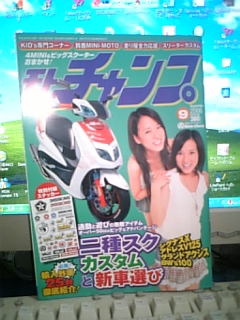 今日も学校で勉強会・・・・いつもの様にバイク⇒電車で行きました難なく勉強も終わり、電車で帰るときも昨日のおっさんは居ませんでしたw電車から降りて駅から徒歩3分程度の場所に本屋があるのでフラフラと立ち寄る・・・・バイク雑誌のコーナーでDVD付きの雑誌を探すもヤングマシンしか見当たらず・・・・(この前買ったしなぁモトチャンプをふと見るいつも立ち読みしてるけど、買ってみようかな・・・ステッカー付いてるしっと値段を見ると『360円』やっすっっっこれなら子供のお小遣いでも買えちゃうね☆(???とりあえず、これから買い続けることにケッテーイ今日かった号にはお気に入りにも入ってる神風雪之丞さんのジャイロキャノピーが掲載されています!!(本人も写ってたりw以上!モトチャンプが安いからってはしゃいでるEnterでした