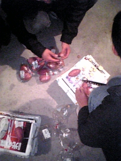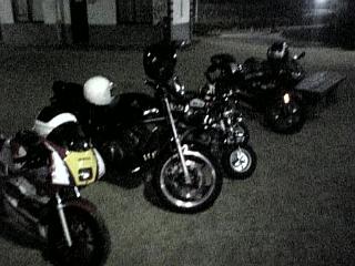 今日もバイトでした~~~しかしバイトを終え、駐輪場に行くとタカ、らっきぃ、ウマニアの姿が!!何やら焼き芋をするとのことでいってきました!!スーパーで、ケンケン、まー君、T君と合流し芋を買ってひろ君宅へ・・・・ひろ君宅に到着時ちょっとしたハプニングが・・お向かいの家のオッサンがこっちをジ~~~っと睨んでくるwいやいやいや・・・・吹かしたりしてないしwむしろ家の前でエンジン切って来たのに睨まれる理由が分からない・・・・まぁそんな訳でひろ君宅駐車場で下準備wその後、俺の家の近くの自然公園へ・・・・ピーポー君が来たときのために、NSR、RS、バリオス2台は置いてスクーター3台で行くことに最初は歩きましたさでもね明かり用にエンジンをかけたが最後マンドクセ~病なのか好奇心なのかスクーターに乗って行くことにスクーター3台に対して人数は8人wまずは2台に二人乗り残り4人は・・・・言うまでも無い4人乗りシートに2人リアカウルに1人アッパーカウルにしがみつき、もう1人w中国雑技団?wでもコレでなめてもらっては困るここは自然公園オフロードなのですよw砂利やら枯葉やらの悪路を総重量200キロほどのスクーターが進むしかも下り坂wwwとまらねぇwそれでもなんとかこけずに到着が・・・・何やら先客がいた模様かまわず準備していたらなにやら話しかけられたwよく見ると高校の知り合いでした(俺の知り合いじゃないけどもう帰るとのことでスルメやらジュースやらレベル40度のテキーラとか言うお魚を貰いましたw(たぶん鮭の仲間飲んでみたけど不味いもっと果物系の風味があったほうが良いさすがレベル40度のお魚(たぶん鮭の仲間)喉がかなり熱い枯葉を集めて焼き芋開始が・・・・なかなか燃えない杉の葉やらを燃やしてテキーラ(魚)を火に吹いて遊んでましただんだん火力がでかくなり開始から約1時間ホクホクに焼けましたうん。美味いけどのど乾く火を消して夜空を見上げると満天の星空でした残り火撮っただけなんだ(´・ω・`)うん。そして撤収またもや4人乗りでwしかもみんなお魚(鮭の仲間だと思う)を飲んでるしw4人乗り&オフロード&お魚で公園の出口へそれからは各家に帰宅~はぁ・・・もう、こんな馬鹿はしません飲んだら乗るなってことでwたとえ魚でもね