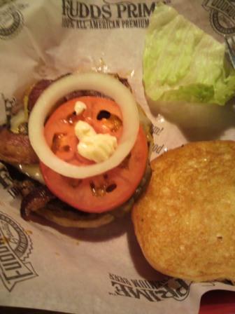 ようやく会えた本格ハンバーガーハンバーグ、4サイズの中から最小のを選んで(でも大きい)ベーコン、マッシュルーム、ベイクドオニオンつきを注文。さらに自分でトマト、オニオン、レタスをトッピング。ピクルスやみじん切りのオニオンもあります。ケチャップや、バーベキューソース、マヨネーズも自分で好きにかけて。出来上がり。写真の見た目より美味しかったよ店内もいい雰囲気。いかにもアメリカ。撮ってないけどエルビス・プレスリー、ローリングストーンズ、などなどあれこれ写真が飾ってありました。美味しかった