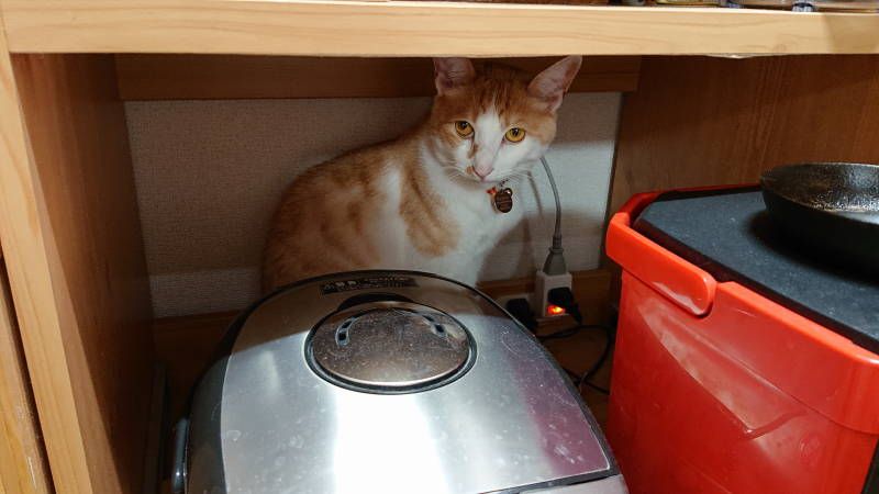 ▲相手してあげなかったら炊飯器の後ろに入って恨めしそうにこっちを見ているウニ…。