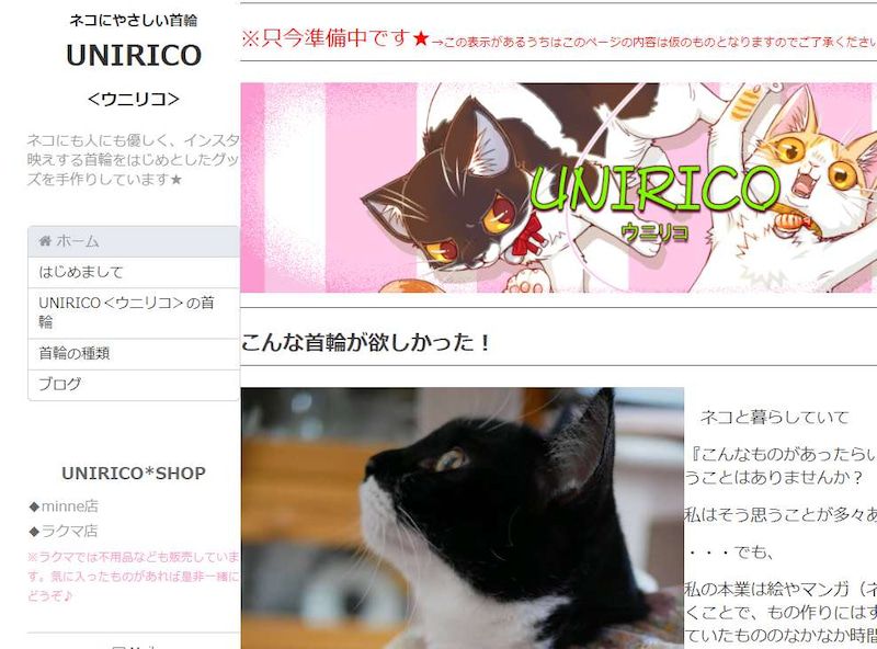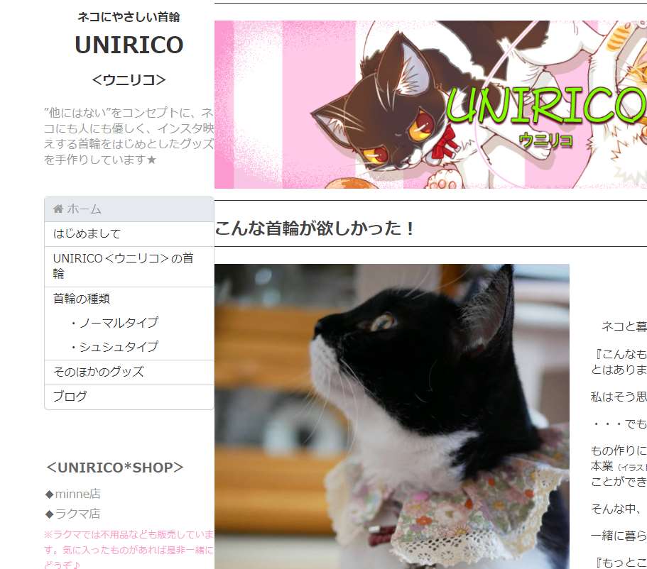なんだかんだと遅くなりましたが(><)今日、minneにいくつかシュシュ首輪アップしたので同時にHPもオープンですヾ(o´∀`o)ノ▼こちらになります~★(クリックでジャンプする…ハズ) UNIRICO*HP首輪は試行錯誤しながら一生懸命デザイン考えたので、まだ至らないとことかあるかもですがぜひ買ってほしい!ଘ(੭ˊ꒳ˋ)੭✧ネコへの愛は詰まっておりますよ~~▼そしてこちらがminneの商品ページです。UNIRICO*minne店現時点ではここまで…ww少しずつアップしてゆきます~ひっそりと迷子札の値段下がってます(笑)。なお、今のところminneでの送料は何個買っても¥100なので是非まとめ買いを次のやつもせっせと作ってます♪この生地、すごく柔らかくて縫うの大変だったよ!▼ノーマル首輪に着けるおリボン♪けっこう可愛くないですかぁ~~?
