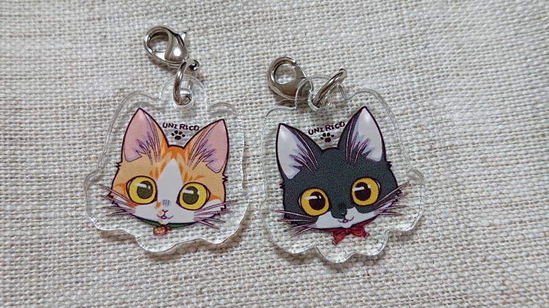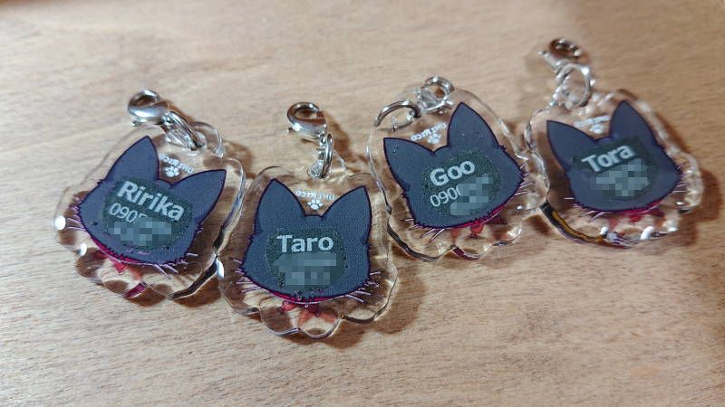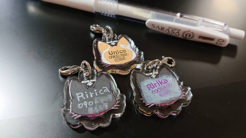 まだまだ準備が未熟な感はありますが、とうとう販売開始してしまいました(๑>◡<๑)▼写真は再利用wウニとリリカ柄です。(クリームトラ白と白黒覆面ネコ♪)アクリルの透明感がキレイでかわいいです ▼着用イメージその2(1つ目は商品ページにあるw)うちの子たちはすでに迷子札つけてるので、これもつけるとジャラジャラですがw一つなら軽くてなかなか良いサイズではないかと思います(*´▽`*)ホントは『この迷子札絶対いいよ!みんなつけて!』・・・って、大きな声で言いたいけど…絵柄がまだ2種類しかないので他の色のニャンコを飼ってるみなさんには申し訳ない気がするし・・・ 名前入れにまだ発展の余地あり…という気がしていて・・まだ『迷子札』より『チャーム』としての機能が勝ってる気がするので…(涙)今は『どちらでも使えます』って控えめに言っておきます(笑) ・・・minneの販売ページにも載せましたが、一応こちらでも改めて紹介しておきますね★ 絵柄は2種類で、それぞれ4つのパターンからお選びいただけます。 *** 選べるパターン ***①そのまま…+¥0*何もついていないTOPの画像のものです。②ネコちゃんの名前&TEL入り【印刷文字】・・・+¥200*裏面にネコちゃんのお名前と、連絡先TEL番号を「印字」したものをはりつけてハードレジンでコーティングします。つやつやの仕上がり♪*ご購入の際に『ネコちゃんのお名前/飼い主さんの連絡先TEL』をお知らせくださいね。▼コーティング見本。(手荒れひどくてすみません)→もうちょっとキレイにできるかも(手荒れじゃないくてwコーティングの方)③ネコちゃんの名前&TEL入り【手書き文字】・・・+¥100*裏面にネコちゃんのお名前と、連絡先TEL番号を「手書きで記入」してハードレジンでコーティングします。文字はナチュラルな感じでつやつやの仕上がり♪(上の写真を参考に★)*私がひとつひとつ手書きで書きます(*´ω`*)・・・へたっぴな文字でもよいという方のみご指定ください。*ご購入の際に『ネコちゃんのお名前/飼い主さんの連絡先TEL』をお知らせくださいね。 ▼文字入り見本(上の2つが『印刷文字』、下が『手書き』です。)※文字が汚く見えるのはモザイクのせいかもw④鈴つき・・・+¥100*チャームとして使う方用にご希望で★*鈴の色はご希望を伝えてくだされば多少お応えできると思いますが、無いこともありますので基本お任せにさせていただきます。ご了承ください。*付属するのは鈴一つのみです。▼鈴見本。肝心の本体のお値段は¥500になります。安くできるようにたくさん作ってしまったのでぜひ買ってやってください(笑) 少しはけたら新しい柄も作れるかもしれないのでよろしくお願いします~一応デザインは作ってあったりw↓ふふ・・( *ᵅั ω ᵅั*)