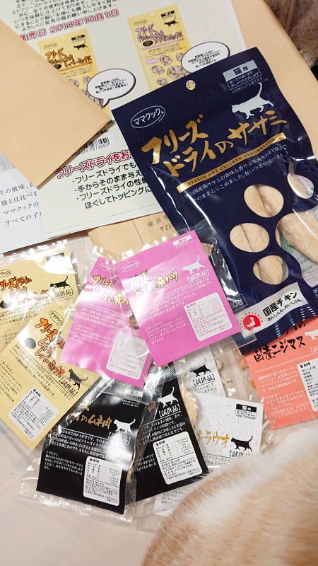 7月ごろにTwitterで「ママクックさんからサンプル届きましたー!」・・・という報告ツイートが流れてきて、私は思ったのです。ママクックって何?!・・・だって名前だけ見ると、クッキング関係のイメージじゃないですか。でもみなさんの写真はネコのおやつ!すぐ調べたら、どうやらフリーズドライの犬猫のおやつを作っているメーカーさんで、会員登録をするとサンプルがもらえるというお話。 その時は『あ、コレお店で見たことある!なんか高級そうなやつだ!』とハイクオリティなおやつに目がくらんでササっと会員登録したわけです( *ᵅั ω ᵅั*) 1ヶ月くらいした数日前…ついに来た!いっぱい入ってた(ありがとうございます!) で。ここで私は我に返ったわけです。ものすごいリアルな形をしたお肉や白魚(ホント標本のよう!(笑))を見て、ね!…こんなの、うちの子食べられるんだろうか??! 実は、少し前まではウニの方は案外何でも食べる子でウエットフードもあげていたのですが、最近はどんどん偏食化していって…2匹ともドライフードしか食べないんです。たまにドライフードのちょっといいやつ(おやつ?)に混ざってる煮干しなんかも、手で細かくしてあげないと食べないくらいで・・・ ドキドキしながら開封してると、当然のようにウニチェック入りま~す (。・x・) ゞ興味はあるようです。でもなんか…食べ物として…というより、『何コレ?』っていう感じw私も嗅いでみたけど…パッケージがちょっと生臭くて・・・( ˘•ω•˘ )ちょっと不安が・・・w とりあえず、一番細かくて食べやすそうな『ムネ肉レバーミックス』っていう、上の左写真のやつを指であげてみました。 が、少し舐めてからそっとかじって…結局残してしまいました( ˘•ω•˘ )ダメか―――・・・とその時は封をしてそのままだったんですが、次の日フードに細かくしてトッピングしたら・・・いつの間にか無くなってるではないですか! メーカーさんが言うように喜んで食べるほどではなかったけど・・・まぁ…無駄にならずに済むからいいかーと思って、この手段であげ続けようと思います! ******************************************************************* 次の日、トッピングがかなり早い段階でなくなっていました。『意外と美味しいな』・・・って気付いたのかな?!1袋分消費したので、次は別のを細かくしてあげてみようと思います。 ムネ肉。これはちょっと手ごわそうだぞ…とキッチンバサミで細かくして少しずつあげました。 なんと!いちばん最初に拾って食べ始めた!▼食べてる動画★※楽天ブログへの動画の投稿方法が分からないのでアメブロの方でご覧ください(><)このあとウニはこれだけでも欲しがるようになったので、次はまた新しい・・・ 『豚ハツ』を細かくします。これは手でサクサクほぐれたけど…部分的に脂があって、ちぎりにくいとこもありました。 ・・・で、ここでまさかの展開! 喜んで飛んできたのに…いまいち期待外れだったみたいなのです…(;´Д`)ブタだからかなぁ?それとも思った味じゃなかったから躊躇したのかなぁ?******************************************************************* とりあえず、サンプルいただいたのでご報告でした★また全種類あげたころにレビューつづき書くかも