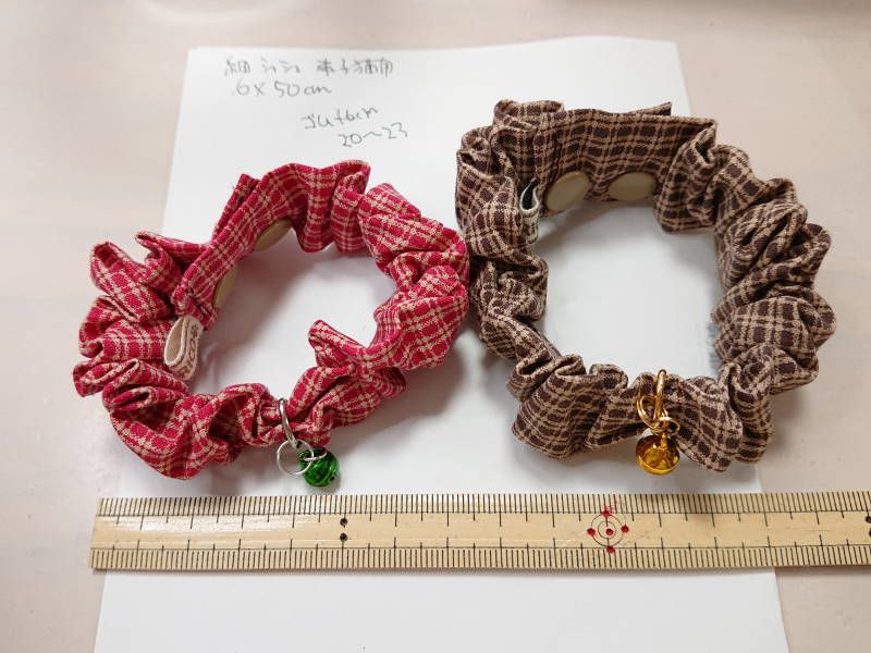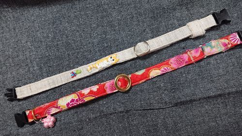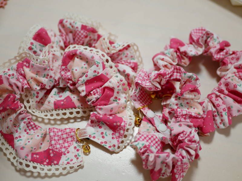 今度はサイズ感とかの探り入れてます(*´▽`*)なのでいっぺんに4個作りました!イチゴとかチェリーのパッチワーク柄♪フリル付きとナシ+幅太めと細めです。着用イメージ▼ フリル付きなんだけど太いのか細いのかもうわからないですねwでも、なんとなく個人的にはフリル付きは細い方、ナシは太い方…が可愛い気がする。黄金幅なのかな??! 布サイズ大きくしてバカなことにゴムも長くしたのでwサイズがLサイズになってしまったwwいちばん小さいとこ(スナップ)でウニにジャストサイズです※体重5kgちょっとです。************************************************************************* お裁縫始めたばかりの私には色々やりたいことがありすぎてなんだか収集つかなくなってきたので(笑)、とりあえずこの『シュシュ首輪』と『刺繍首輪』の2パターンでちょっと突き詰めていきたいと思います。でもやっぱり今気に入ってるのはシュシュの方かな♪正直、シンプルに『シュシュ』だけでいいんじゃないかって気もするのですけどwもともと、ただのシュシュに疑問を感じて作ってみたわけなのでもうしばらく作り続けてみます。キーは果たしてサイズ調整やスナップ(安全対策)が必要なのか。・・・この疑問の答えがそのうち出るはずଘ(੭ˊ꒳ˋ)੭✧→一応、日常の首輪としてつけることと、ニャンコの安全を考えて作っています(*´▽`*)・・・なので、Dカンと鈴つき♪これなら迷子札もつけられるし、私たちに居場所を知らせてくれる鈴もかわいいです鈴のサイズにもこだわって、音はするけど耳障りなほどうるさくないものにしました。ベルト部分は一番短いスナップで止めるとほとんど隠れるようになっています。3段階調節の予定♪ ちなみに、フリルナシはこんな感じです▼かなりナチュラルにつけてもらえると思う(≧▽≦)