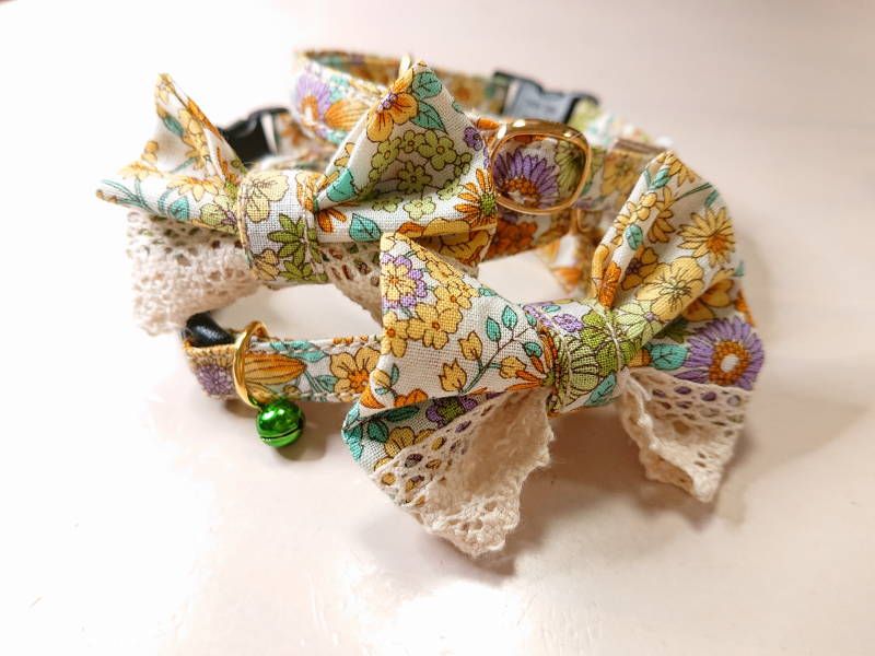 最近、首輪の生地選びが楽しくて・・ついつい悪い癖で買い集めてしまうんですよね(^-^;首輪にするとすごく可愛い柄…っていうのがあって、形にできた時に思った以上に可愛いとめちゃくちゃテンションが上がります今回作ったのは▼コレでーす。黄色い花柄の首輪です♪黄色の花柄は”花の花粉と草花の香りのイメージ”で、鈴は緑色にしてみました★秋というより春っぽいですが。リボンも花畑のチョウチョをイメージして可愛らしくしてみました♪・・・実はコレ、¥100均(セリア)で買ったはぎれ1枚分です(笑)。36㎝×30㎝・・・だったかな?ノーマル首輪ならこのサイズで十分作れるんです★(リボンの分入れて3本分)シュシュタイプはできなくはないんですけど…まず継ぎ足しになりますね(^-^;量り売りで布を買ってると、ちょっと持て余してる感があるので・・シュシュタイプを作るとき以外ははぎれのほうが色々試せるしいいかも~・・とか最近は思ってますw *今日のオマケ*▼私が使ってる鈴です♪宝来鈴【業務用卸パック】 〜手芸 アクセサリー パーツ ハンドメイド 手作り 大量 クラフト コサージュ 金具 安全 おすすめ 激安 プラバン 造花 つまみ細工 和風 バッジ 台座 土台 作品 根付 縁起 キーホルダー〜 価格:657円(税込、送料別) (2019/10/9時点)市販の普通の首輪についてる鈴より小さいけど、ちゃんと音がする8㎜。6㎜だと音がしないのです(´;ω;`)なお、カラー鈴は運よくあればダイソーのが18個入りなので実はここよりもオトク!(すべてのカラーが2個ずつ入ってるしね♪)セリアは数が少なくて高いです。ホントは色指定できるといいんだけどなーーー。始めはカラフル過ぎてダサいと思ってたんですけど、これが単品で使うと可愛くて(><)意外にも金銀より使う頻度高いです!