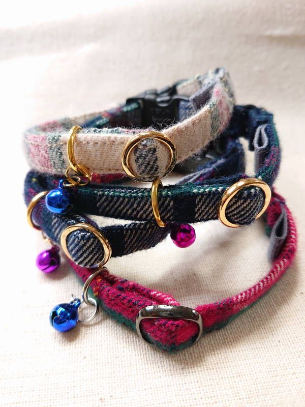こんばんわ(*´▽`*)秋色シリーズ続編!今度はノーマル首輪を作ってみましたよ★布の部位によって色味が違う布だったので、二つと同じ色がないんです★赤が強いのや紺が強いの。いい感じに両方混ざってるの…いろいろですずらーって並べるとなんかカワイイ鈴の色は生地に合わせてゴールドとブルーの2色に、バックルはシルバーで統一してみました★鈴…ピンクもあったwバックルも一つだけブロンズでしたwそして今回もウニに試着してもらうと…こんな感じです(*´▽`*)シュシュと比べるとかなり大人しく感じますね~~正面から見ると実にシンプル(リボンの位置は変えられますので、鈴ともっと近づけたほうが可愛いかも?)もうちょっとリボンは大きくてもいいかもしれませんね(*´▽`*)色の入り方で大分違う。あくびさん(笑)。リリカは赤いのは似合うんだけど・・・ネイビー寄りのつけたらなじみ過ぎて見えなくなってしまったw ・・・で写真で一見よく見えるんですけど・・・今回けっこうの率で失敗してしまいました(><)実はノーマル首輪って縫うのけっこう難しいんですよね…。ベテランの方だったら『何言ってんの』って思うのかもしれないけど(><)まだ技術に乏しい私がやるとどうしても縫い目がガタついてしまうんですね・・・。特に分厚い箇所が難しい…例えば…↓この写真なんか裏側なんですけど・・・真ん中片の縫い留めてるとこが汚い!(><)・・・でももっと汚いのが実はリボンのついているところ(涙)。ここはもうリボンで隠すしか!・・・っていう力技で縫い留めて隠しました(涙)。リボンを固定しても特に使用には問題ないので(見た目も含め)、うちの子用か…誰かにあげる用(笑)。一つだけ『訳アリ』として今、minneに出品してます。半額でwもし興味のある方いらしたら買ってあげてください(^-^; まだまだ模索中ではあるのですが、今はミシンの糸と針をちょっと厚め用のにしてみてます。▼このあたり。【フジックスFUJIX】シャッペスパン厚地用ミシン糸 30番-1 100m 【C1-2】※ゆうパケットNG! 価格:302円(税込、送料別) (2019/9/19時点)【オルガンミシン針 HA×1】家庭用ミシン針Eカラー レギュラータイプ 5本入 【C1-4】U-OK 価格:249円(税込、送料別) (2019/9/19時点)若干…きれいにできている気がするのですが・・・どうなんだろう?もっとすごい針とかないのかなぁ?家庭用で…分厚いのぶすぶす縫えるやつ…。なお、今はこんな色の布で作ってます★ちょっと似た感じのチェックなんですが・・・色はだいぶ均一ですね~。肌触りは似てる柔らかい布なんですけど、ちょっとしっかりしてるかな。▼ここで買いました(*´▽`*)♪★在庫限り★ 123706200 先染め ヘリンボン シャーリングチェック◆◆◆(数量×50cm)【C2-6】U2.5 価格:324円(税込、送料別) (2019/9/19時点)