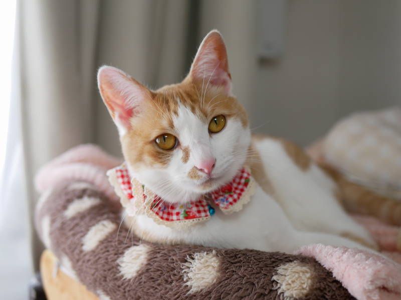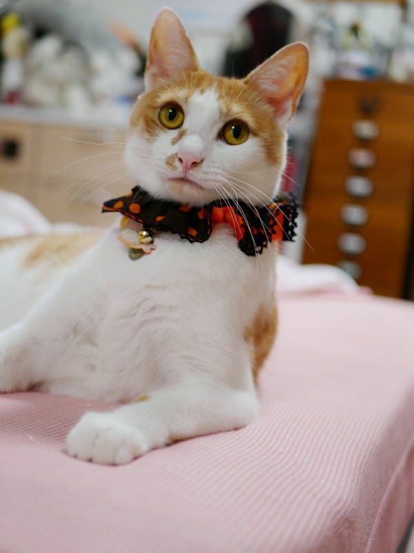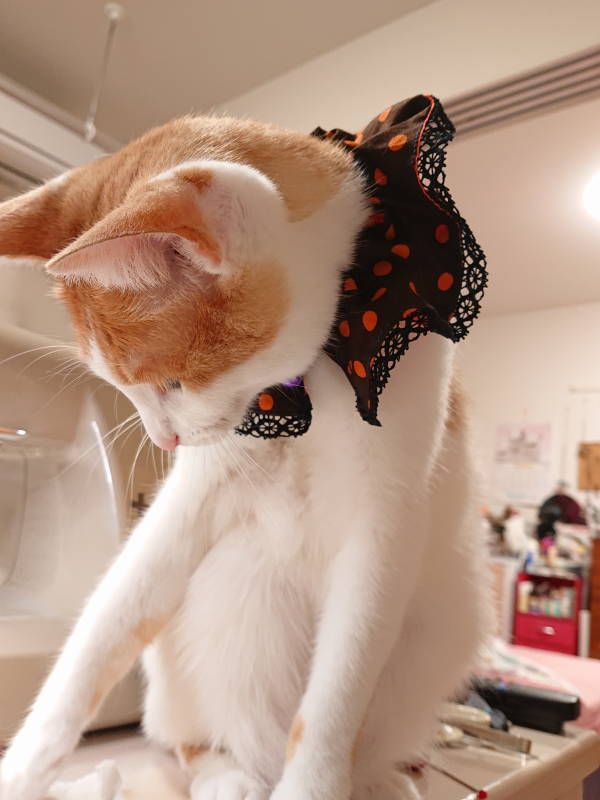 今日紹介するのは、前回のに比べて幅を狭く作ったタイプです。 前のは“つけ襟”っぽかったですが、こっちは“シュシュ”って感じですね(*´▽`*)▼自前の寿司エビがついてますがw こんな感じ。幅が狭いほうがうねりができて、裏の生地まで見えるのでハロウィンぽさがぐっと上がるかもしれません★▼寝転がっててもしっかり見える“映え”力!寿司エビついてるのもアレなんでw自前の首輪外したらかみかみしてます。そんなに自分の首輪、好き?▼後ろから見てもこの通り。裏地がしっかり見えますね♪今回のみたいな、生地を2枚貼り合わせる方法は初めてやってみたんですけど、なかなか出来栄えが面白かったので、またやろうと思います。