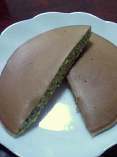 抹茶ホットケーキをつくってみました。切るときれいなみどりいろ。あんまり膨らまないのはわたしの腕のせいです。ホットケーキのこつはテフロンのフライパンで油をひかずに焼くこと。きれいなきつね色に仕上がります。