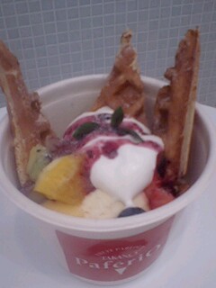 ルミネ1階にあるタカノフルーツパーラー・パフェリオアイスとワッフルとフルーツのパフェ。うまいです\(>▽<)/