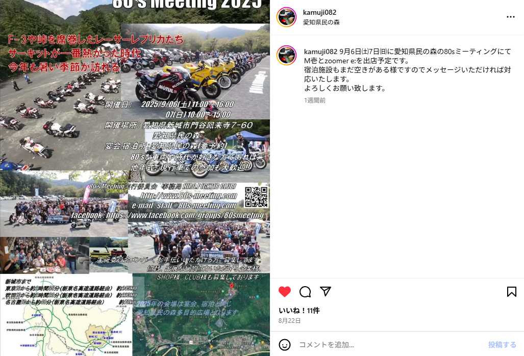 昨年に引き続きAug 27, 2024 ☆☆☆9/8(日) 80'sバイク女子 ちりんさんが、80's Meeting 2024 二日目のMCに!!☆☆☆今年も、GAGにNSR50、FZR250Rを駆る、三重県の80'sバイク女子、ちりんさん80's Meeting 2025の初日のMCを、お手伝いしていただくことになりました!!!!2019年に琵琶湖畔で行われた、GAG MEETINGに、紅一点参加された彼女も、今はバイク女子として活躍されています。もちろん、80's Meetingの主役は、参加されている皆さんです!!ちりんさんに、皆さんの80'sの愛車自慢や思い出なんかを聞いて回っていただきますよ!皆さん、ちりんさんを、応援してあげてください!!!!昨年の80's Meeting 2024のレポートにも、ちりんさんの綺麗な画像がたくさんありますので、こちらも是非!2024/09/07(土)-08(日)愛知県新城市 80's Meeting 20242024年09月08日 80's Meeting 2024 二日目 開幕前に、人生初モトコンポ乗らせていただきました!二日目、開幕いたします!MCは、80'sバイク女子、ちりんさん参加いただいたバイク達空撮と集合写真まだまだ来られます!そして、抽選会開催!閉会、皆さんお帰りです。そして、ちりんさんの撮影会など皆さま、お疲れさまでした!ありがとうございました!Instagramhttps://www.instagram.com/crnr.26/Youtubehttps://www.youtube.com/@crnr.26TikTokhttps://www.tiktok.com/@crnr.26Xちりん@MotoGP❤️🔥@c26sub今週末は80's Meeting✨️土曜日はMCをさせていただきます‼️ご都合合う方は来てください😊💖🌟 80's Meeting 2025🗓 2025/9/06(土)-07(日)※私がMCするのは6日だけです。📍 愛知県民の森 多目的広場 pic.twitter.com/ddkRarcwnv— ちりん Chirin (@crnr26) September 2, 2025 FZR250RとGAGとNSR50(サーキット用)とエストレヤに乗っているちりんです!デビューバイクのGAGは6年前から乗っています。1番の宝物です!FZR250Rは3年前から乗っています。1年前からInstagramでの活動を開始して今ではYouTube、TikTokにも動画を投稿しています。#80sMeeting#バイク女子#GAG#FZR250R#新城市#愛知県民の森ぎゃぐみー!!参加の時の、ちりんさんのGAGちりんさんのお父様のGAG