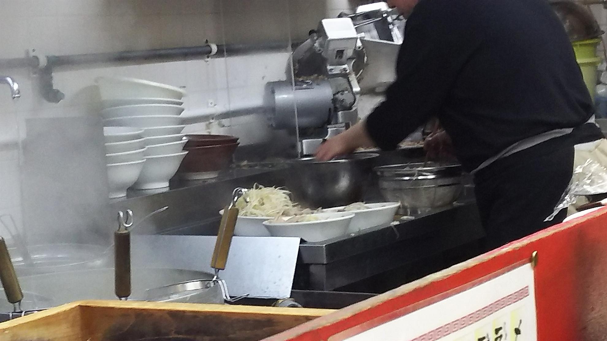 盛り付けは、全部、片手でおもいっきり握って、どんぶりに、投入。。。チャーシュー薄切りの山から、ねぎの山から、もやしの山から。。。。