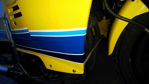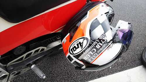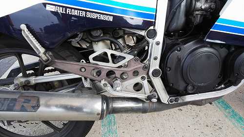 今は純正のマフラーに戻されたそうですが、レーサーサイクロンが角度が違ってて、バックステップでないと付かないとかで、純正のステップの位置を上げてる!!