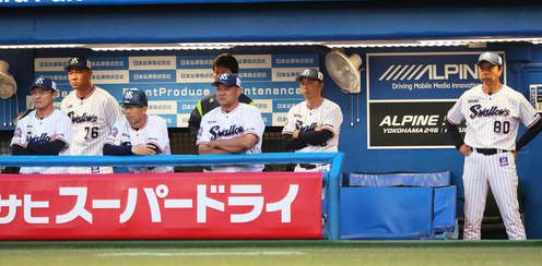厳しい表情で戦況を見つめるヤクルト小川監督(右端)ら(撮影・足立雅史)