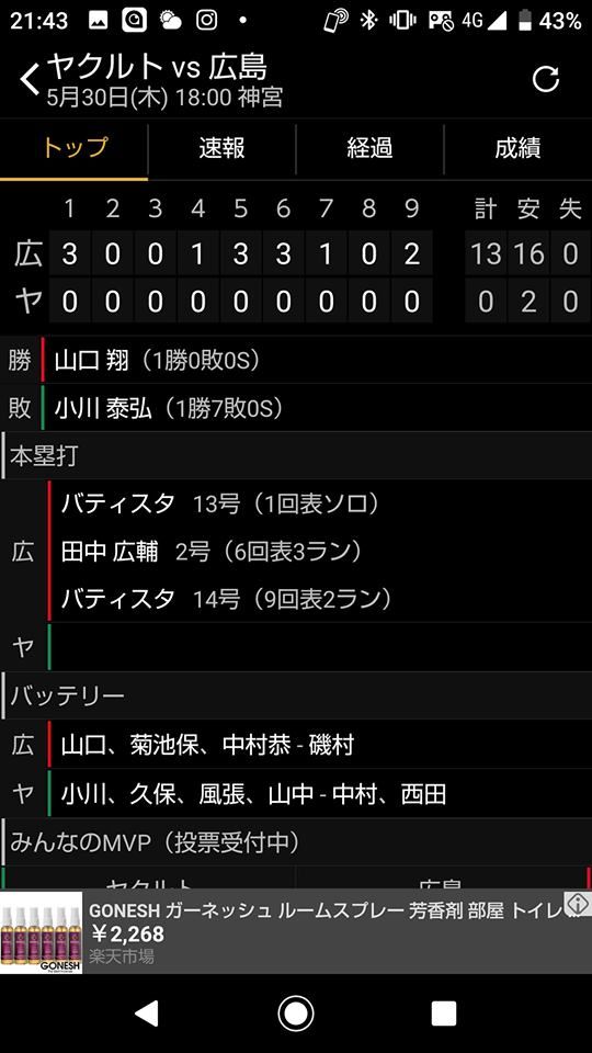 セ・リーグ ヤクルト0―13広島 ( 2019年5月30日 神宮 )