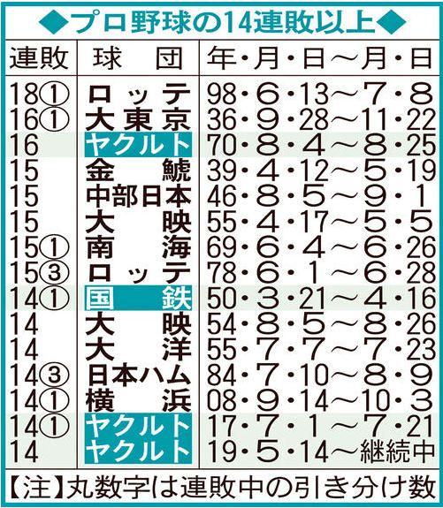 年間96敗を喫した17年の7月に記録した14連敗に並んだ。球団ワーストは70年の16連敗。また本拠地神宮球場での連敗も09年以来の10となった。