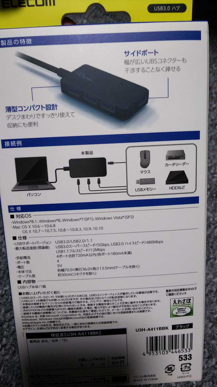 エレコム USB3.0 ハブ 4ポート バスパワー タブレット向け ブラック U3H-A411BBK