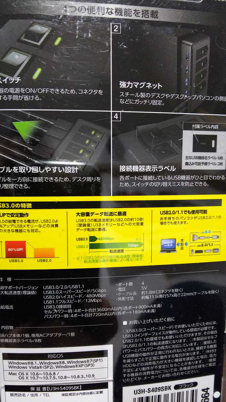 エレコム USB3.0 ハブ 4ポート ACアダプタ付 セルフ/バス両対応 マグネット付 電源スイッチ ブラック U3H-S409SBK