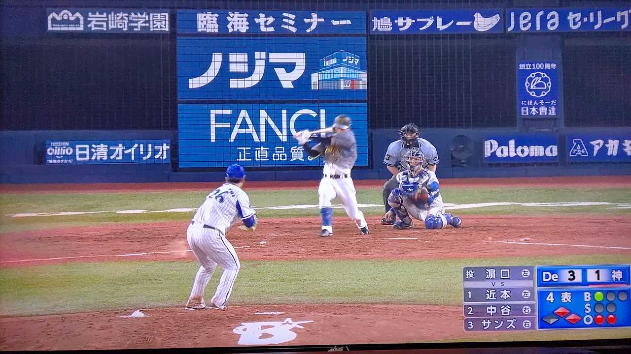 一方の濱口もピリッとしない。4回表 阪神は梅野・右前安打と木浪・四球で無死1・2塁とするが、植田のバスターが捕邪飛、青柳もバント失敗と拙い攻撃で二死となる。しかし、1番 近本は右前適時安打を放って1点を返すと、続く中谷が変化球をレフトへ運ぶ逆転の2号3ラン!サンズも2者連続の左越え8号ソロ本塁打を打ち込んで、阪神が6対3とリードを奪った。DeNA濱口はこの回限り4回(87球)8安打4三振3四球6失点で交代。国吉が5回表から2イニングを抑える。
