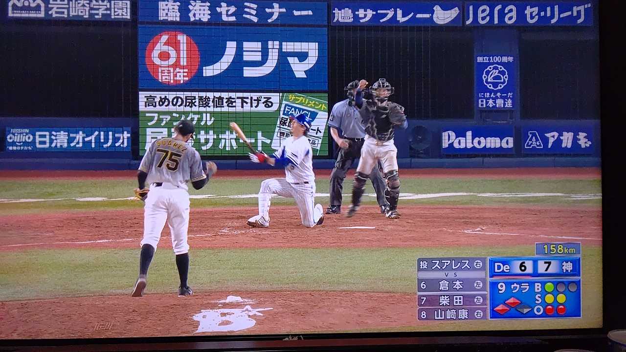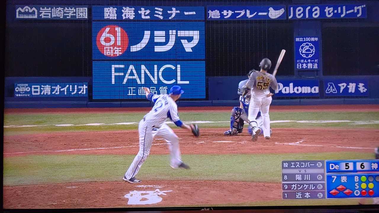 リードをもらった青柳は、丁寧な投球で4・5回を抑えたが、6回裏 先頭・中井に中前安打を許すと阪神ベンチはリリーフに能見を送る。能見が倉本に中前安打を打たれ、柴田の犠打で一死2・3塁となり代打・ロペスが出て来ると、今度は3人目・ガンケルにスイッチ。ガンケルはロペスを詰まらせ二飛に抑えるが、途中出場・9番 戸柱に右前へ2点適時安打を浴びて、1点差とされてしまう。