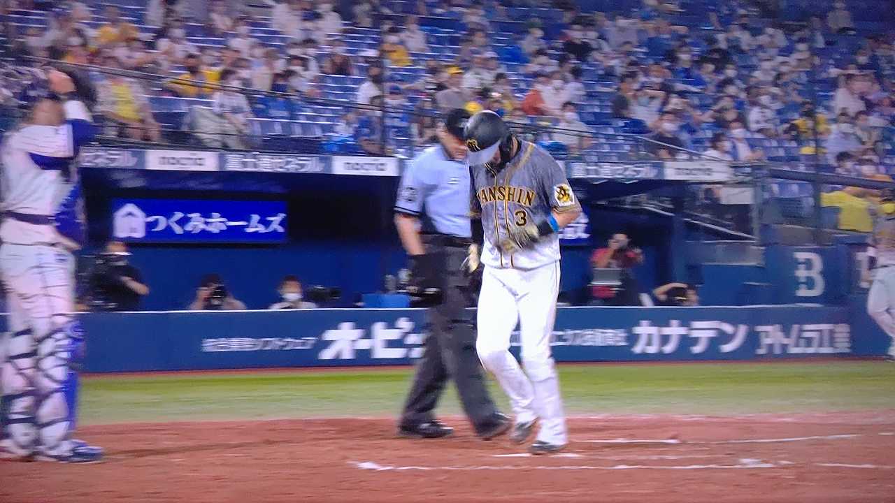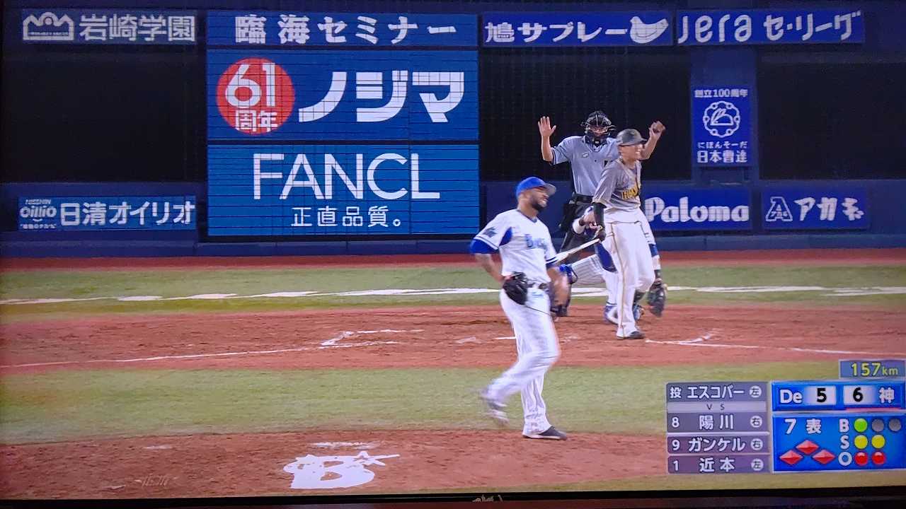 7回表 阪神は大山・四球を挟んでサンズとボーアのヒットで無死満塁とするが、5番ボーアのところから3人目・藤岡に代わった左腕エスコバーの前に、梅野・木浪が倒れ二死となる。植田の代打・陽川は、エスコバーの投げミスで押し出し死球。阪神が1点を追加するも、ベンチは次のガンケルには代打を送らなかった。その裏 続投のガンケルは、先頭・宮崎に死球をぶつける。右手首付近に当たった宮崎は代走・大和と交代するが、ガンケルは後続を退け、この回を無失点で乗り切っている。