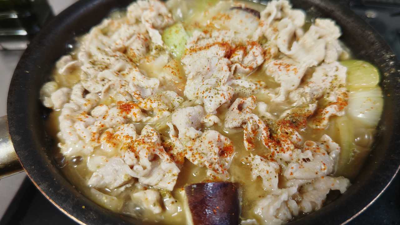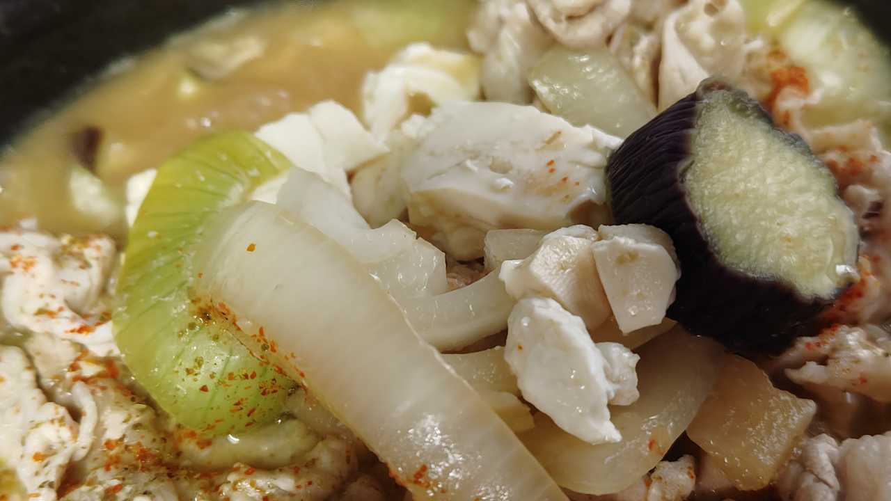 豆腐一丁、玉ねぎ大一個、豚バラ に 大きな茄子も、一本入れてみました。超具だくさん豚汁。。。