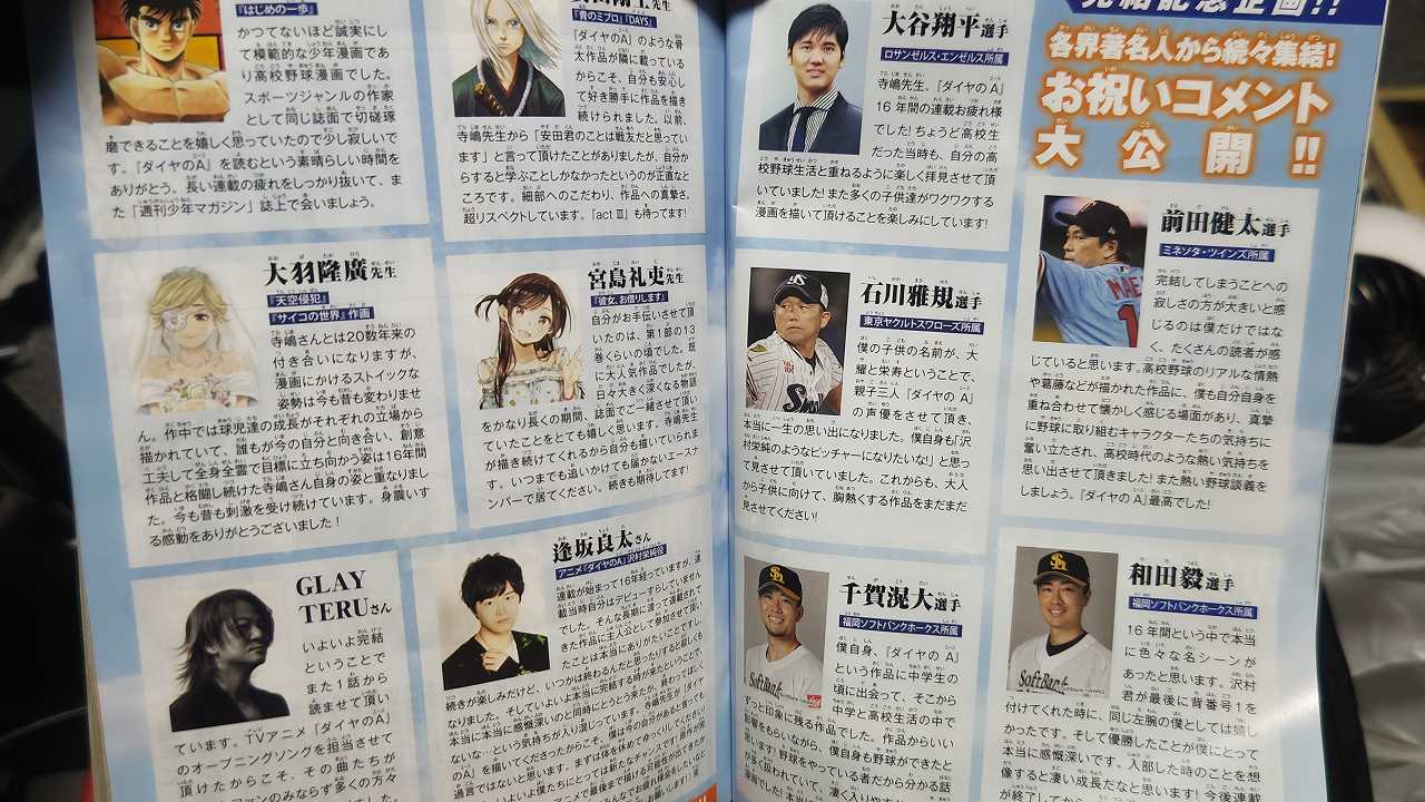 本日発売の週刊少年マガジン48号では『ダイヤのA actⅡ』最終回企画!プロ野球選手、漫画家、そして『ダイヤのA』に縁の深い超豪華な面々からお祝いコメントをいただいております。ぜひ誌面にてご確認ください! #ダイヤのA #ダイヤのA最終回 pic.twitter.com/E9A1jQYFG9